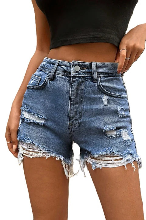 Acesti pantaloni scurti din denim pentru vara, la moda si casual, cu gauri si tiv destramat, sunt o piesa esentiala pentru orice garderoba de vara. Designul cu gauri si tiv destramat adauga un aer cool si modern, perfect pentru un look urban si relaxat. Materialul din denim asigura durabilitate si confort, fiind ideal pentru zilele calduroase si activitatile de zi cu zi. Poarta-i cu un tricou simplu si adidasi pentru un stil casual si relaxat sau cu o bluza lejera si sandale pentru un look boem si chic. Indiferent de cum decizi sa ii asortezi, acesti pantaloni scurti din denim pentru vara, cu gauri si tiv destramat, sunt o alegere versatila si trendy pentru garderoba ta de vara.